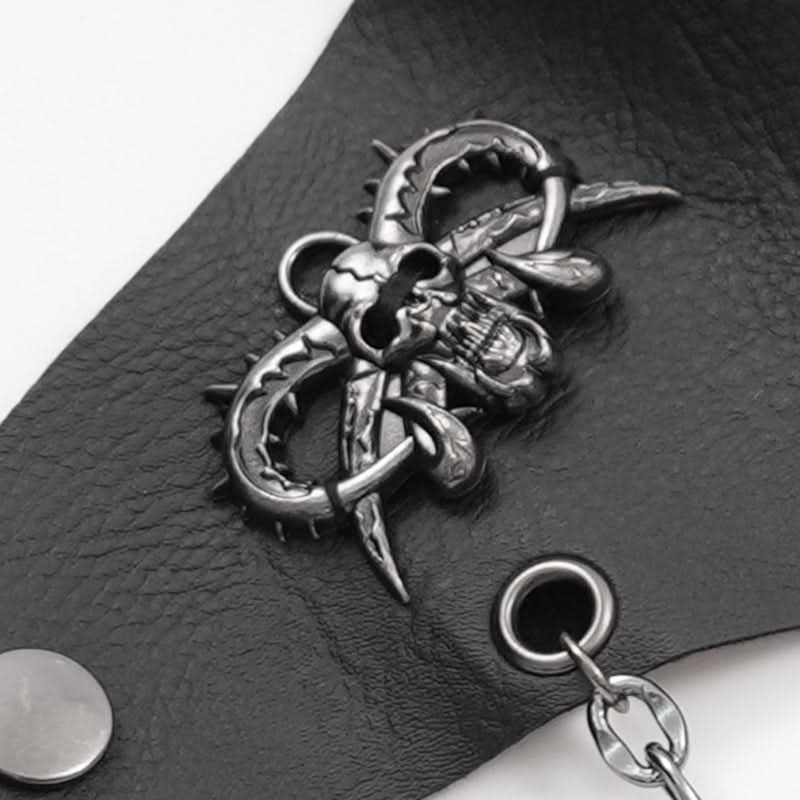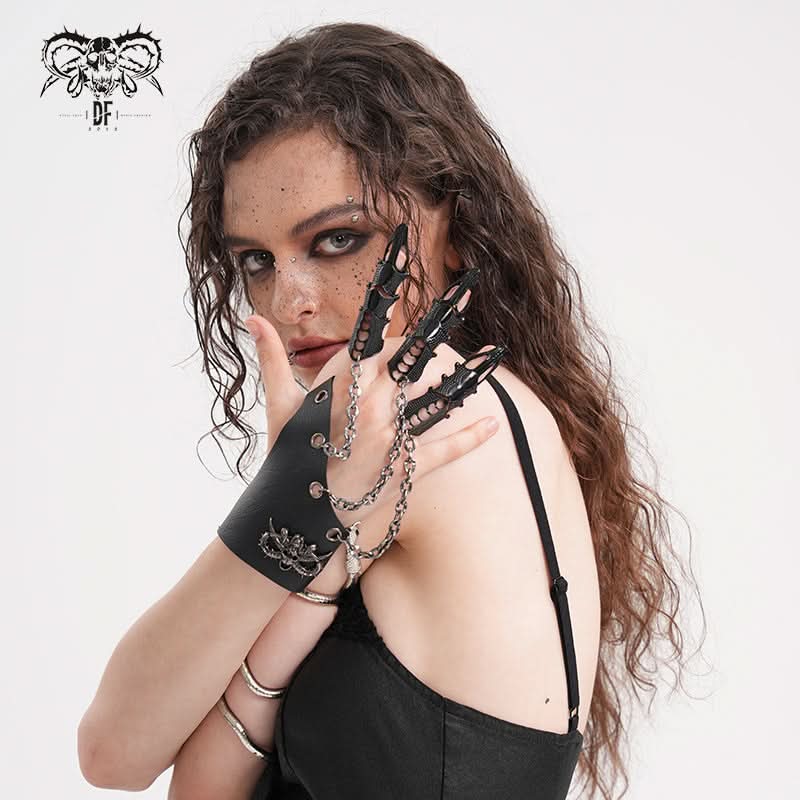 The Necronomicon Claws Wristband is a punk-infused accessory that pairs asymmetric black faux leather with connected armour rings for an aggressive, ritual-ready vibe.