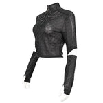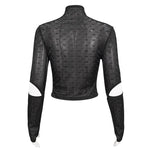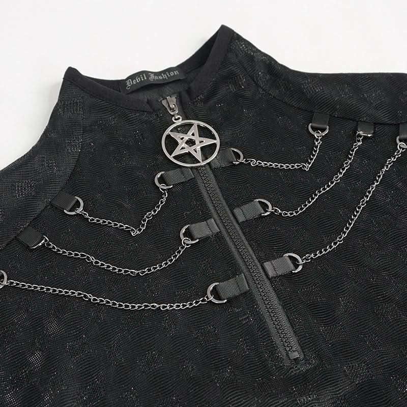 Il présente un col haut avec des manches longues découpées et une fermeture éclair avec une breloque pentagramme sur le devant.