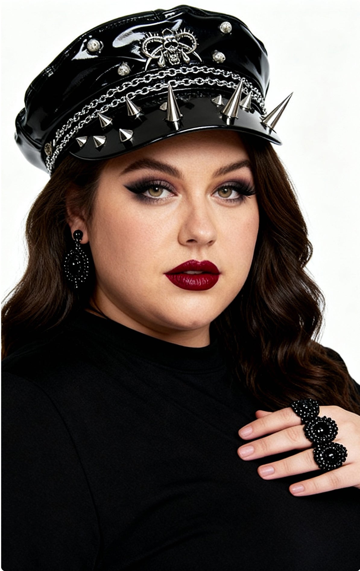 Defy the ordinary with a military-inspired hat that embodies rebellion, adorned with daring studs and chains for an unforgettable edge.