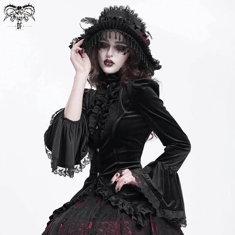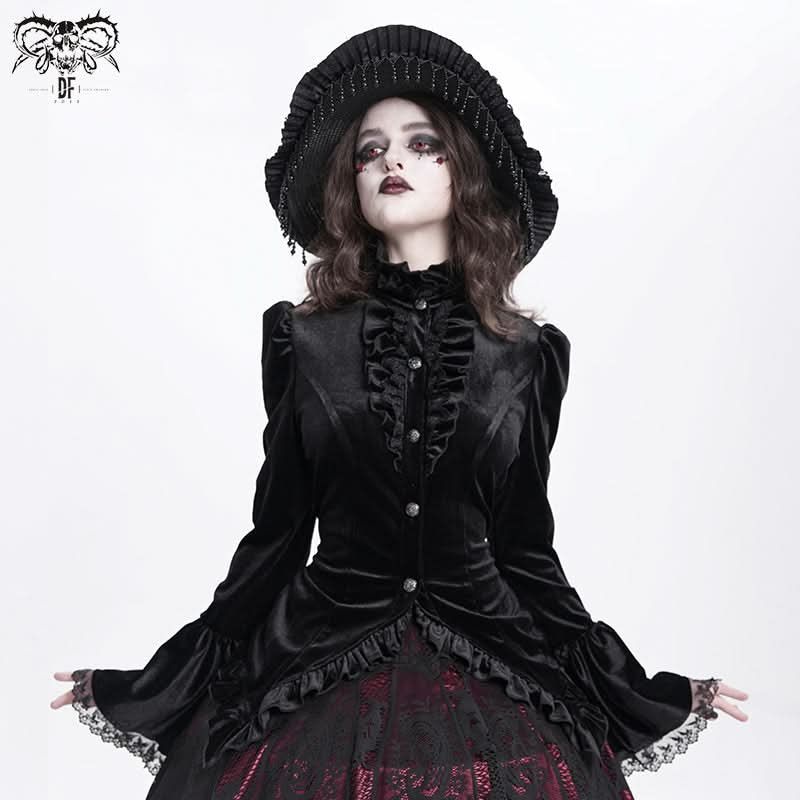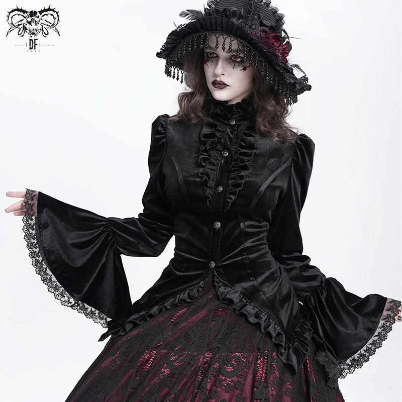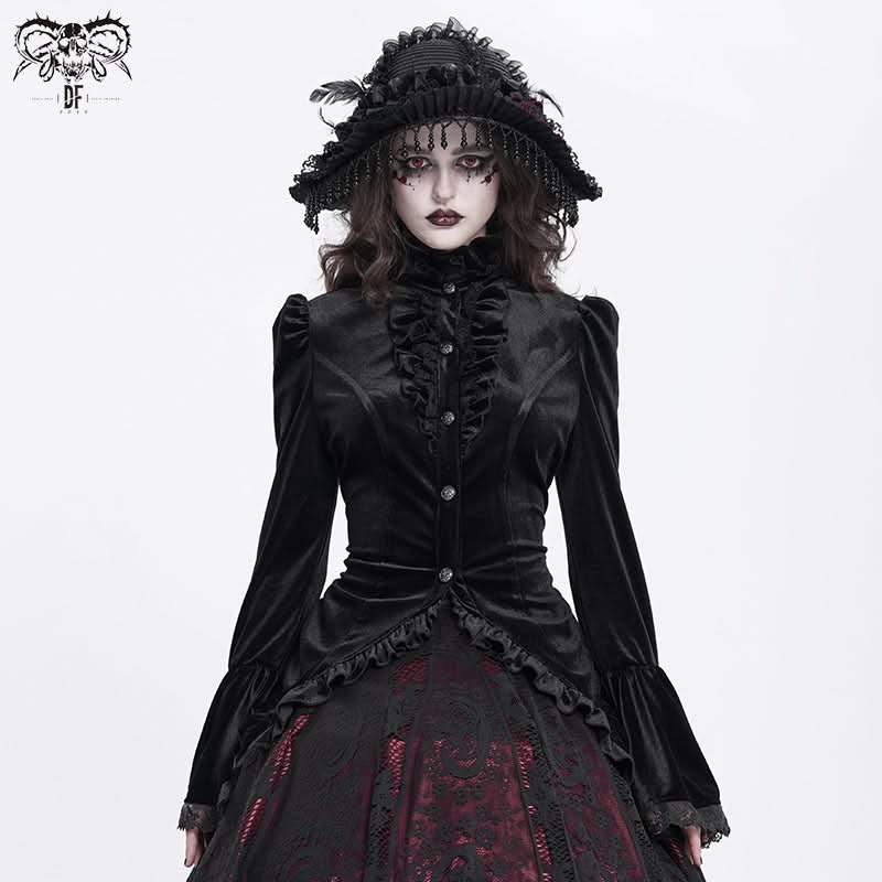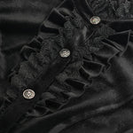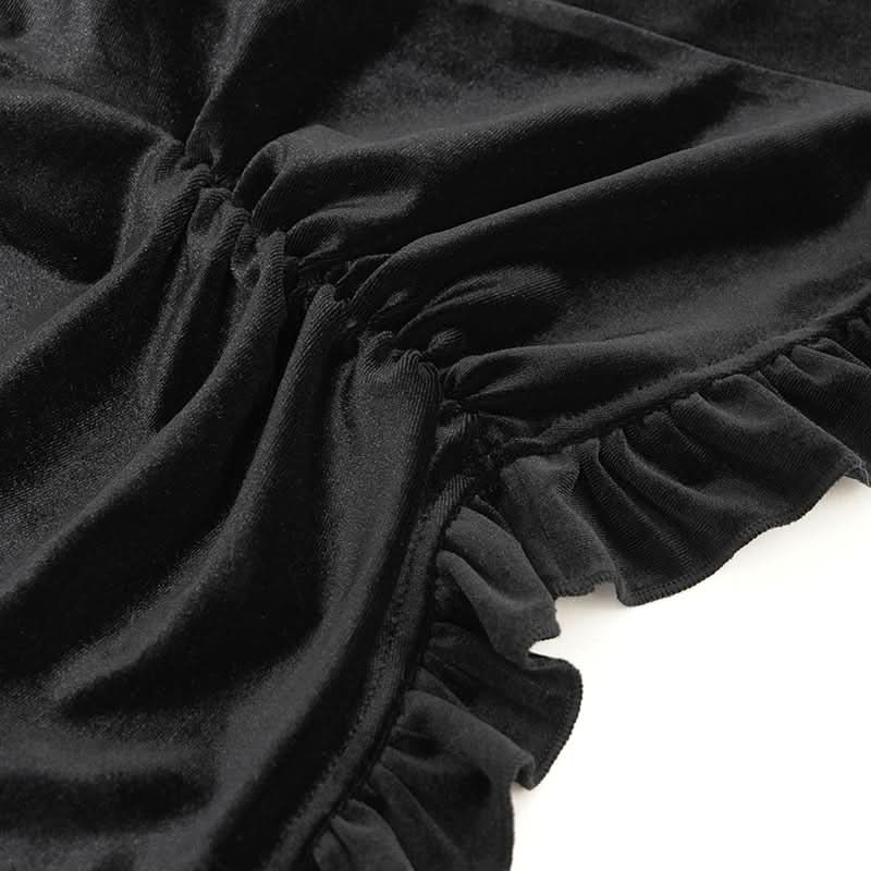 • Glossy black velvet delivers luxe gothic rock energy.