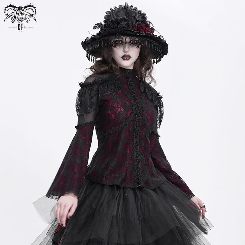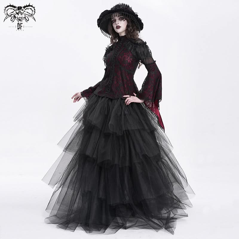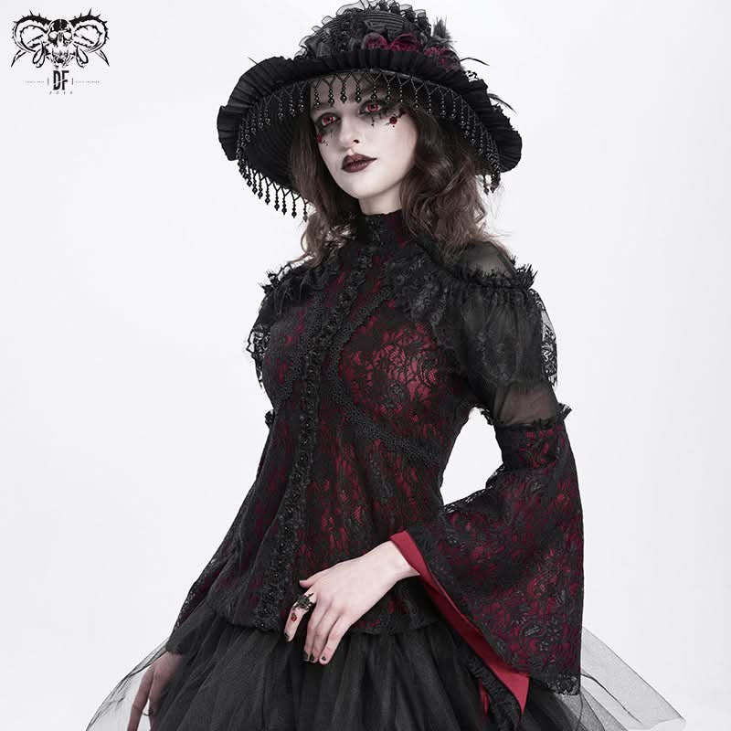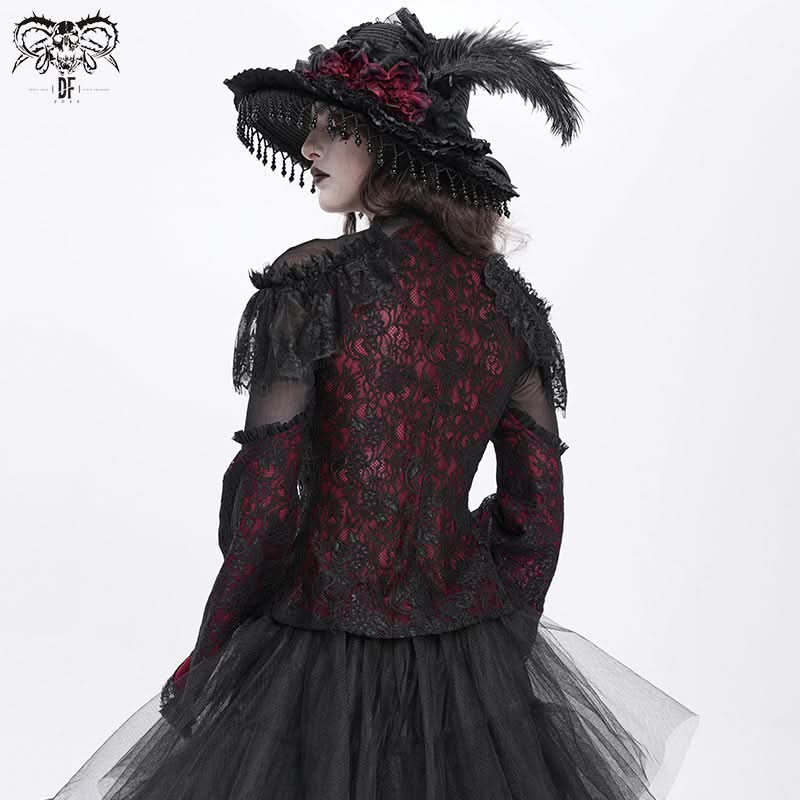 The Blood Canticle Lace Tee blends layered lace mesh with deep dark red hues for an elegantly haunting silhouette.