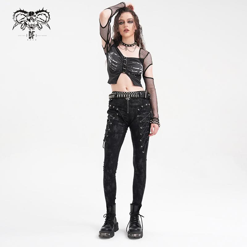 • Super‑stretch knitted laminated fabric delivers fluid punk attitude.