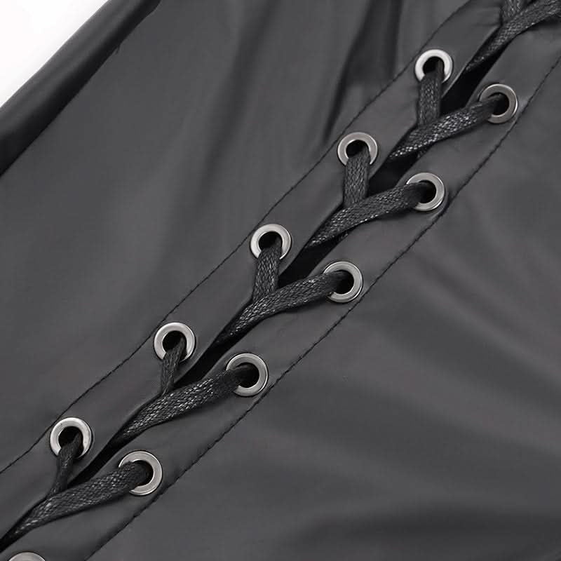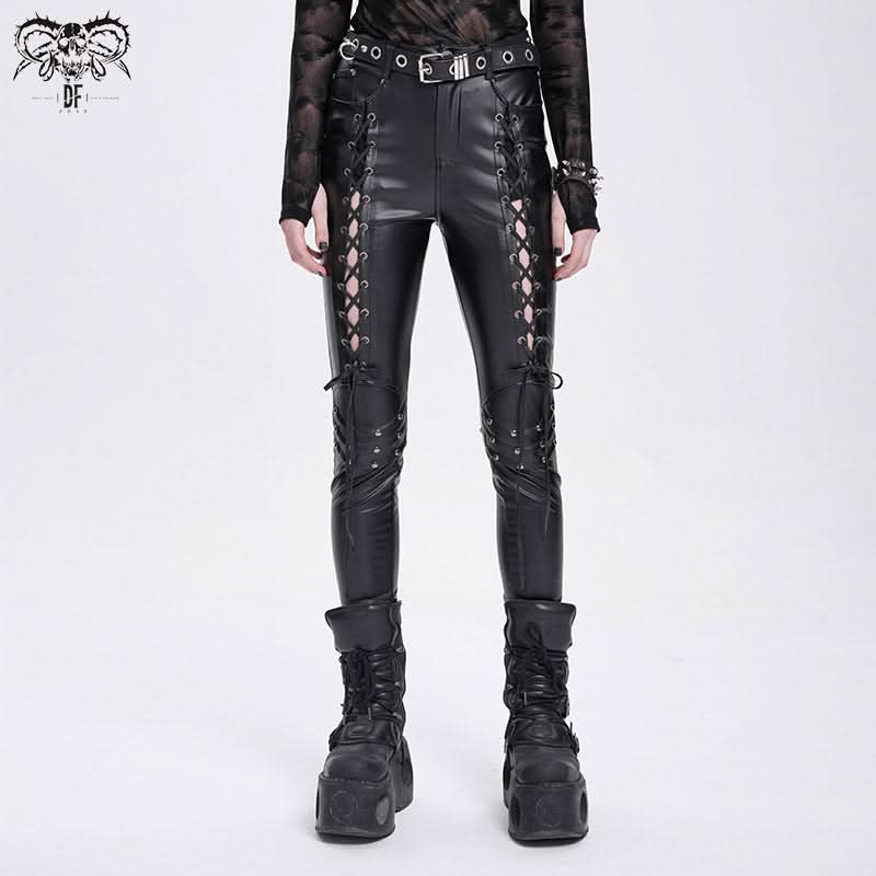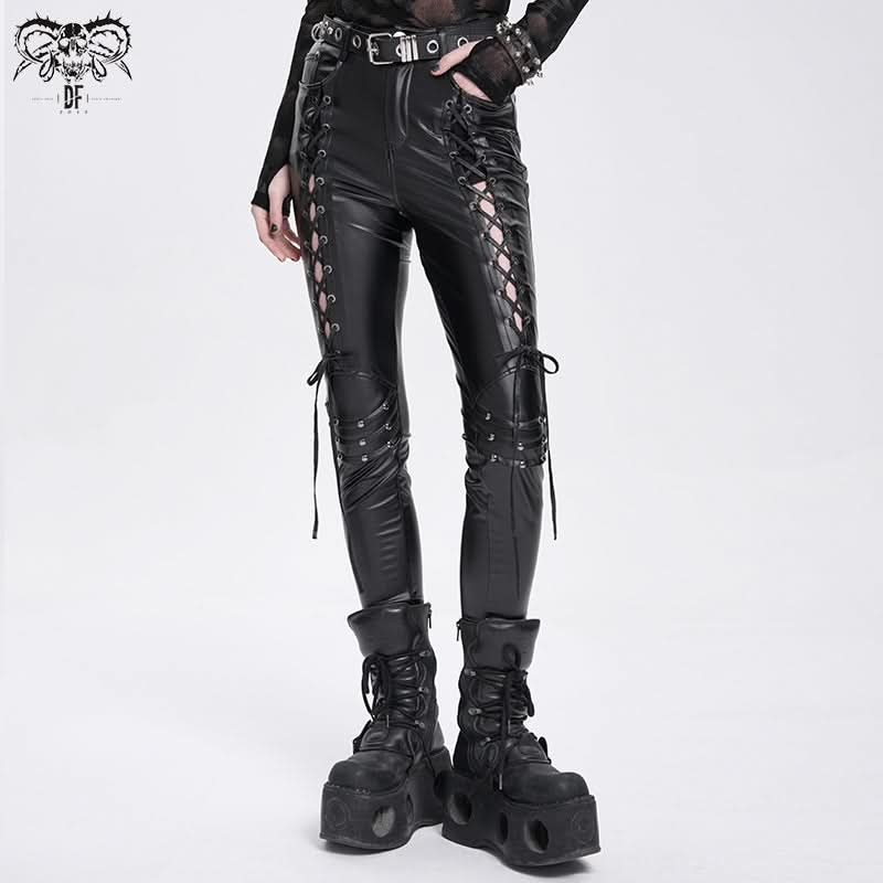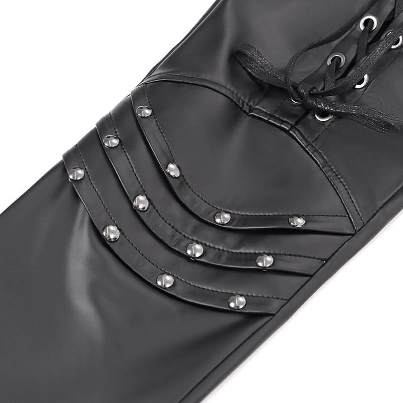 Crafted from stretchy matte faux leather with thigh lace‑up and stud accents, these slim‑fit trousers fuse punk grit with underground attitude — perfect for headbanging at gigs or commanding nocturnal street looks.