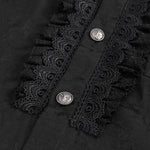 Il présente des manches lanternes, de la dentelle plissée sur l'encolure et des boutons sur la patte de boutonnage et les poignets.