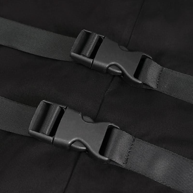 D'autres détails incluent des sangles décoratives en nylon avec des boucles à la taille ainsi que des poignets et des œillets sur le col.