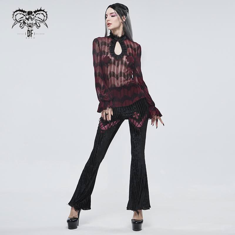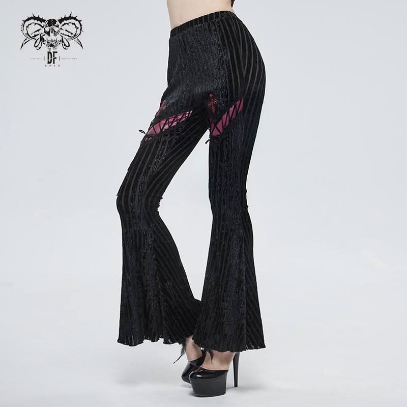 Step into the dark elegance of gothic fashion with our Distortion Gothic Crucifix Bell-Bottoms. These striking bell-bottoms are designed to make a bold statement, featuring intricate lace and crucifix embellishments that capture the essence of gothic style. The distressed cutouts on the thighs add a unique flair, making these pants perfect for those who dare to stand out.