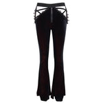 Featuring a unique cutout waistline, these pants showcase your individuality and flair. The convenient zipper and elastic webbing ensure ease of wear, allowing you to slip into style effortlessly. The stretchable embellishments at the waistline not only enhance the aesthetic but also provide a comfortable fit, making these pants ideal for any occasion, from a night out to a gothic-themed event.