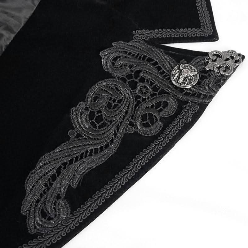 The coat is adorned with a luxurious velvet appliqué collar, intricately embroidered and embellished with striking buttons that enhance its gothic charm. Delicate lace borders the cuffs, adding a touch of femininity to this bold piece. A convenient zipper at the center-front ensures easy wear while maintaining the coat's sleek aesthetic.