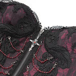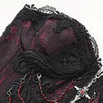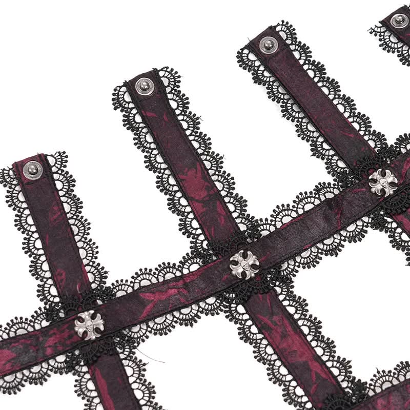 Rich red fabric, floral iris motifs, and cascading fringe evoke phantom ballrooms, secret rites, and blood-tinted sonnets perfect for visual-kei settings, gothic romance, or alt couture that feels like a scene from mythic midnight verse.