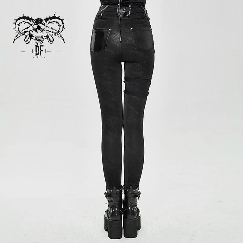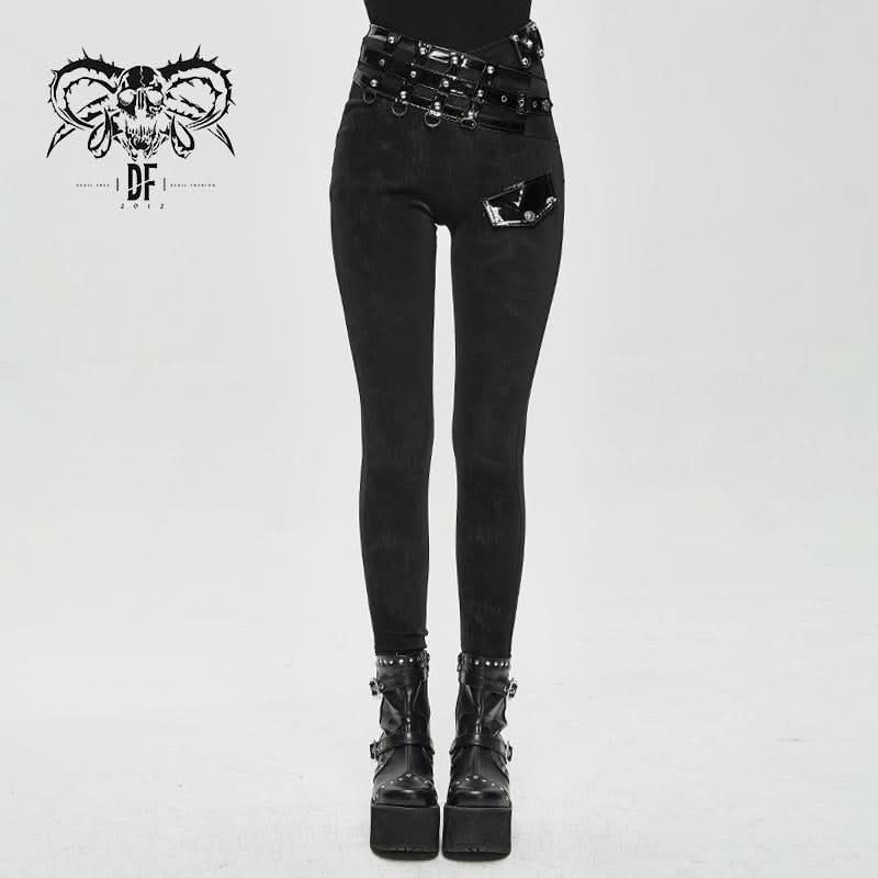 Punk Asymmetric Knitted Stretch Women Pants With Leather Loops