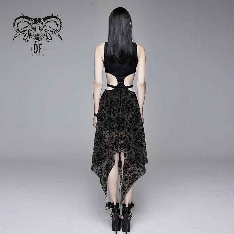 Semilucent Black Queen Cross Flocking Printed Sleeveless Sexy Women Mesh Dress