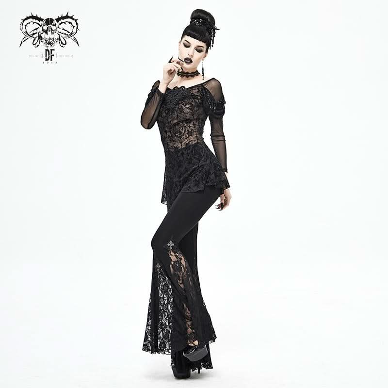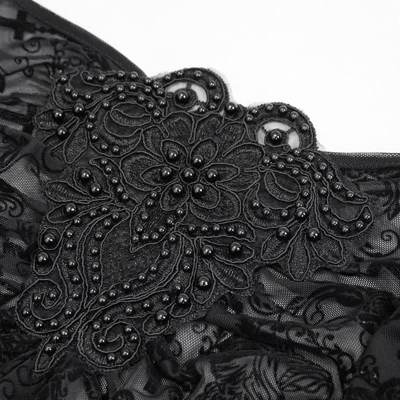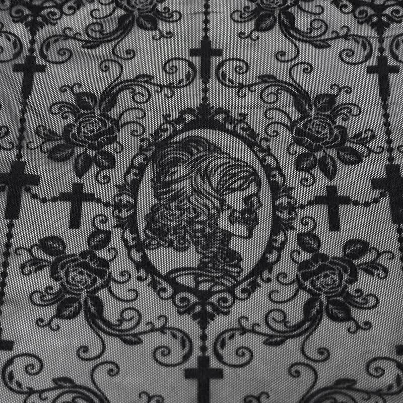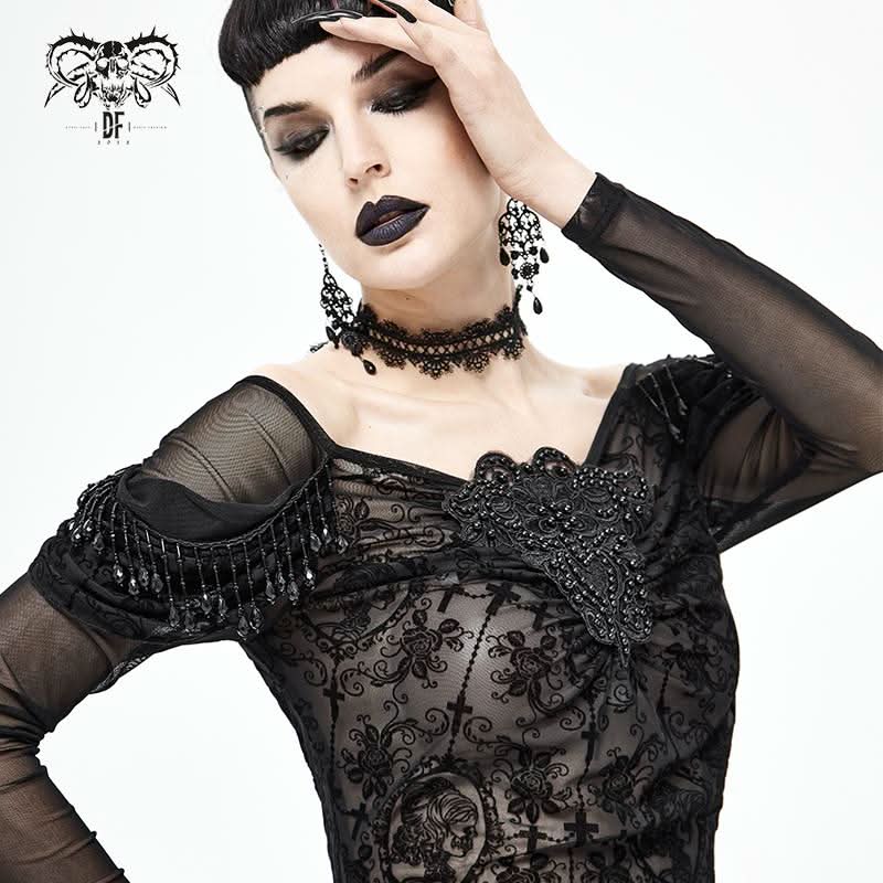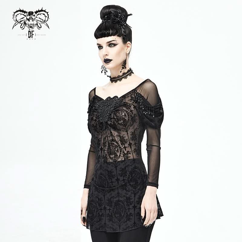 Perfect for layering or wearing on its own, this top offers a translucent quality that enhances its gothic charm. The mesh material provides a hint of elasticity, ensuring comfort while maintaining a stylish silhouette. Pair it with your favorite high-waisted skirt or distressed jeans for a look that captures the essence of gothic fashion.