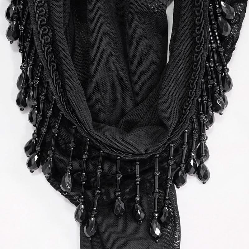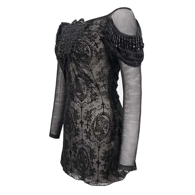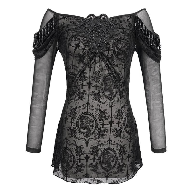 Embrace your dark elegance with the Shadow Song Gothic Mesh Top, featuring a stunning boat neckline that beautifully frames your collarbone. This gothic mesh top is designed for those who appreciate the allure of intricate details and unique textures. The fabric is elegantly embossed and adorned with beaded tassel webbing, adding a touch of mystique to your ensemble.