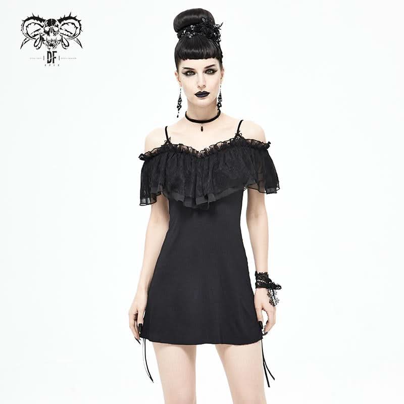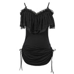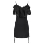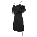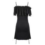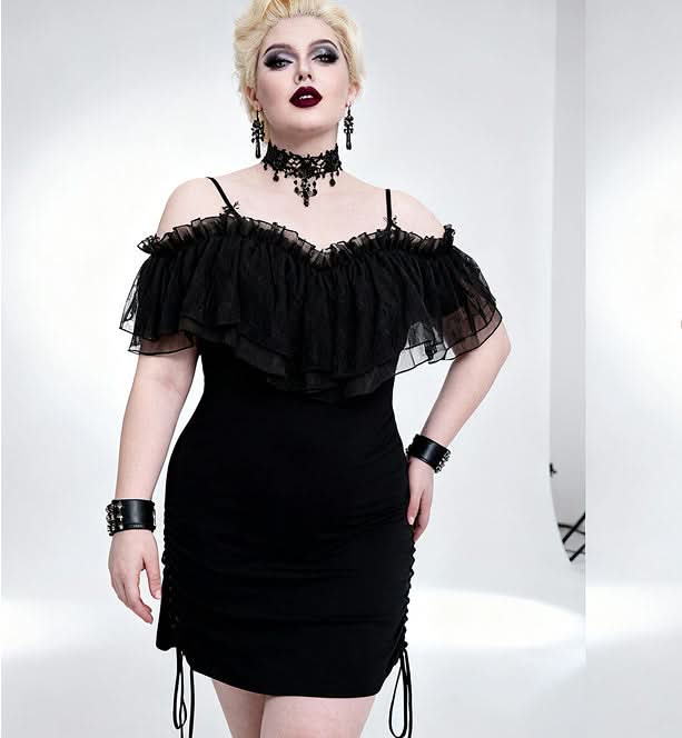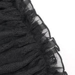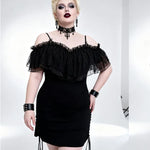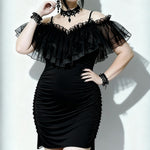 Step into the world of dark elegance with the 'Malady' Gothic Sling Dress/Blouse featuring a stunning bardot neckline. This versatile piece is perfect for layering or wearing alone, allowing you to express your unique gothic style effortlessly. The enchanting bardot neckline is beautifully adorned with layered mesh and satin ruffles, adding a touch of romance to your gothic wardrobe.